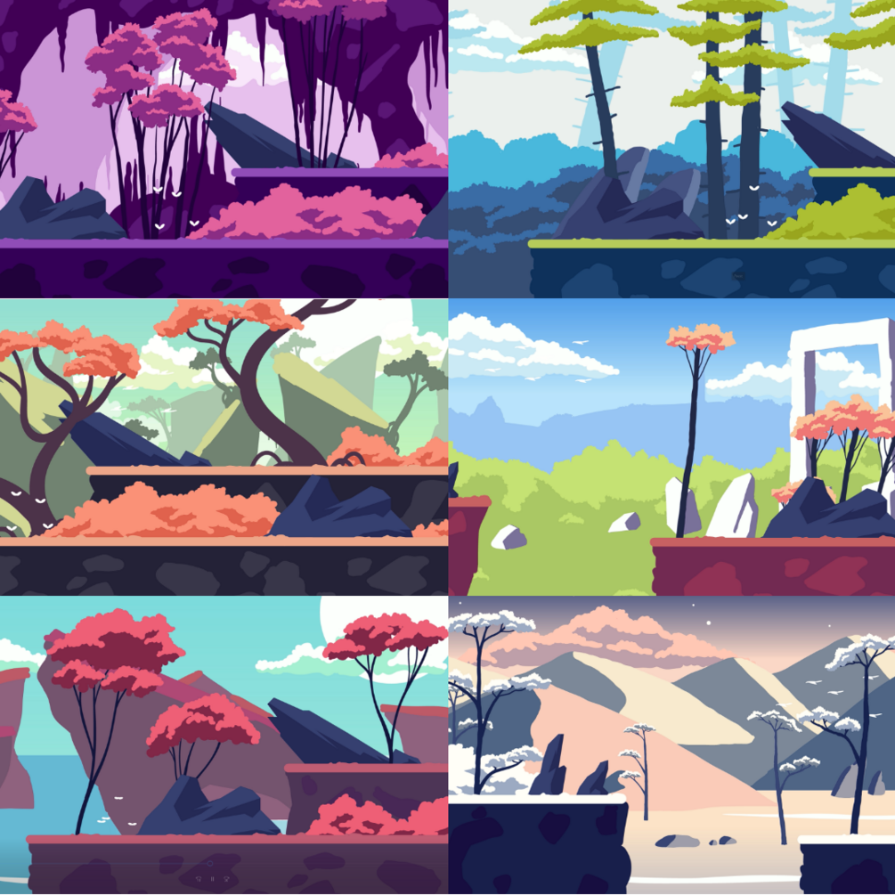 You will get: 7 parallax environments, 5 layers each + special effects (butterflies and birds flying).